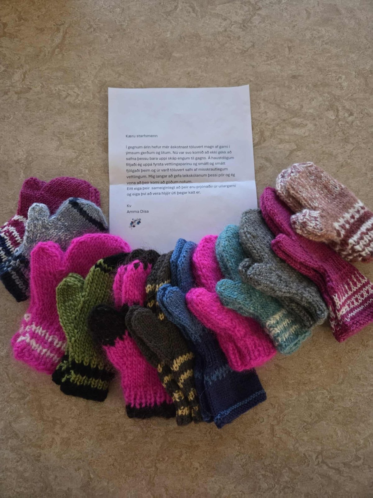 Í morgun fengum við í sendingu frá einni afasystur barns hjá okkur 12 pör af vettlingum. Alveg dásamleg gjöf sem mun koma sér örugglega vel í vetur. Takk fyrir elsku "amma Dísa"