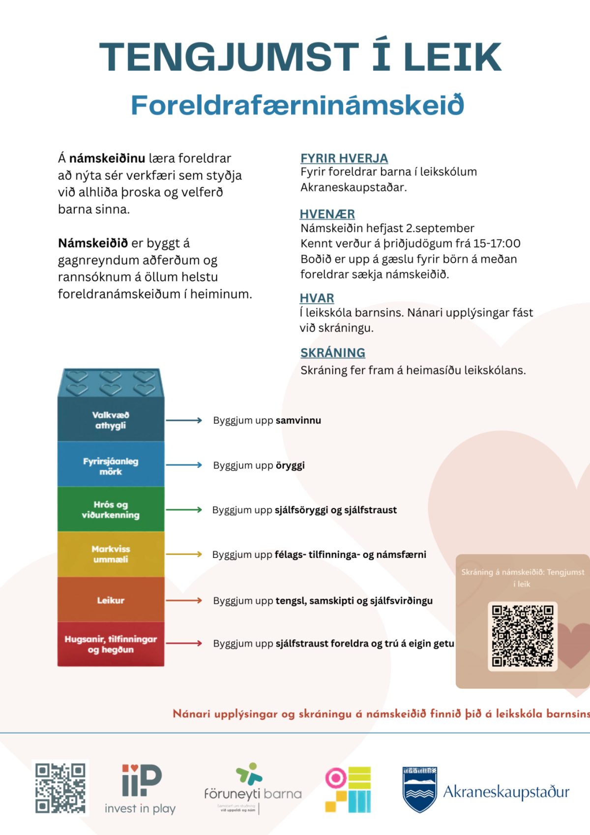 Námskeiðið er 12 vikna námskeið sem byggir á gagnreyndum aðferðum í vinnu með börnum og foreldrum. Tengjumst í leik er námskeið þar sem foreldrar efla sjálfstraust sitt í foreldrahlutverkinu og skapa trygg og góð tengsl við börnin sín. Þannig geta foreldrar betur stutt náms- og félagsfærni, ásamt því að stuðla að aukinni tilfinningastjórn barna sinna.